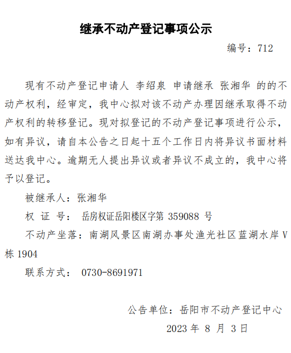 继承不动产登记公示 编号:李绍泉(712)