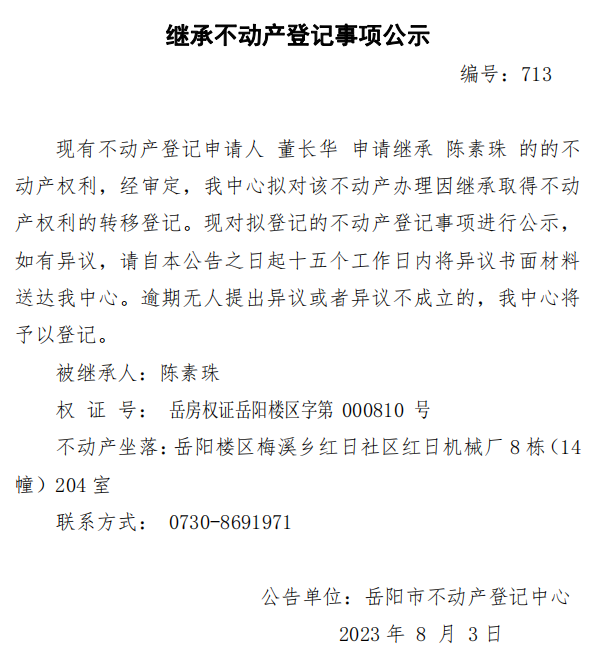 继承不动产登记公示 编号:董长华(713)
