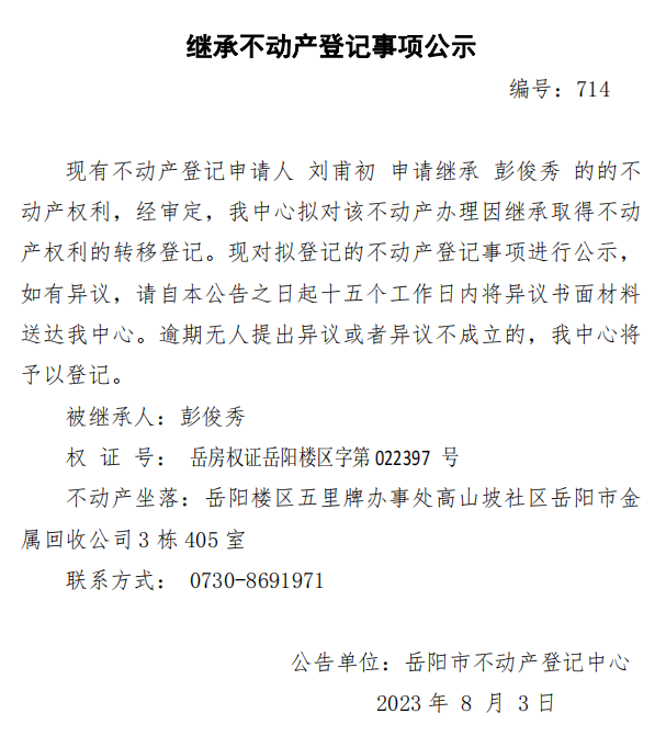 继承不动产登记公示 编号:刘甫初(714)