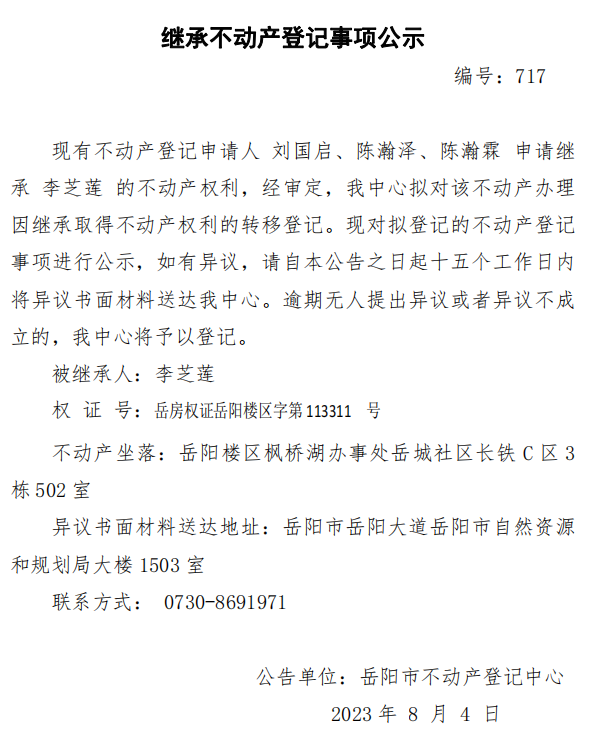 继承不动产登记公示 编号:刘国启、陈瀚泽、陈瀚霖(717)