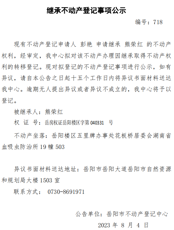 继承不动产登记公示 编号:彭艳(718)