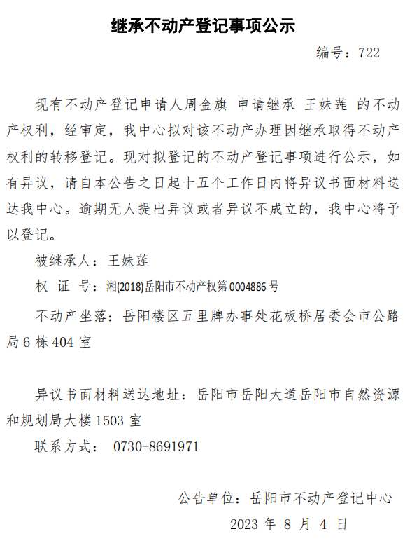 继承不动产登记公示 编号:周金旗(722)