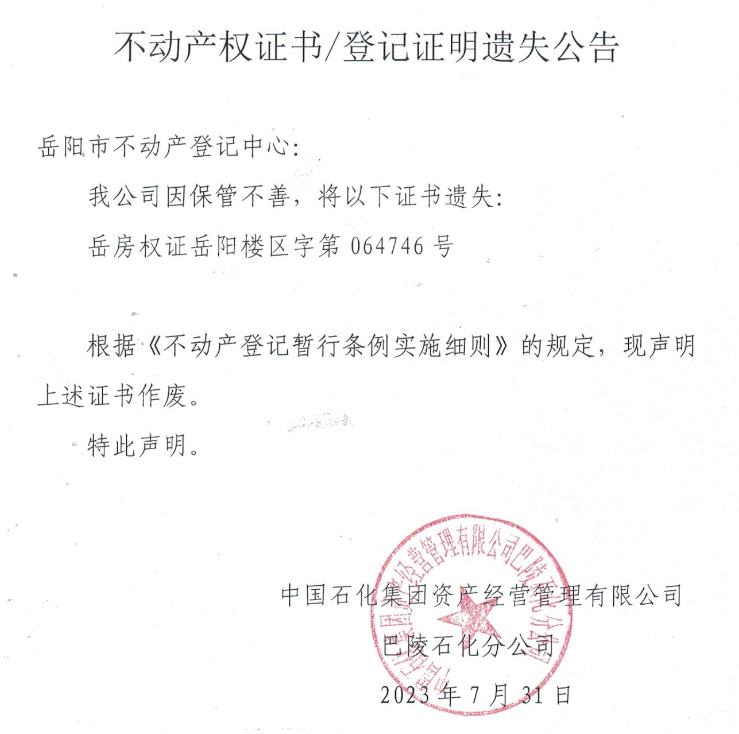 遗失公告(中国石化集团资产经营管理有限公司)