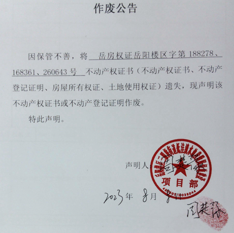 作废公告(岳阳楼区三眼桥街道低洼渍水地段附属绿地建设项目部)