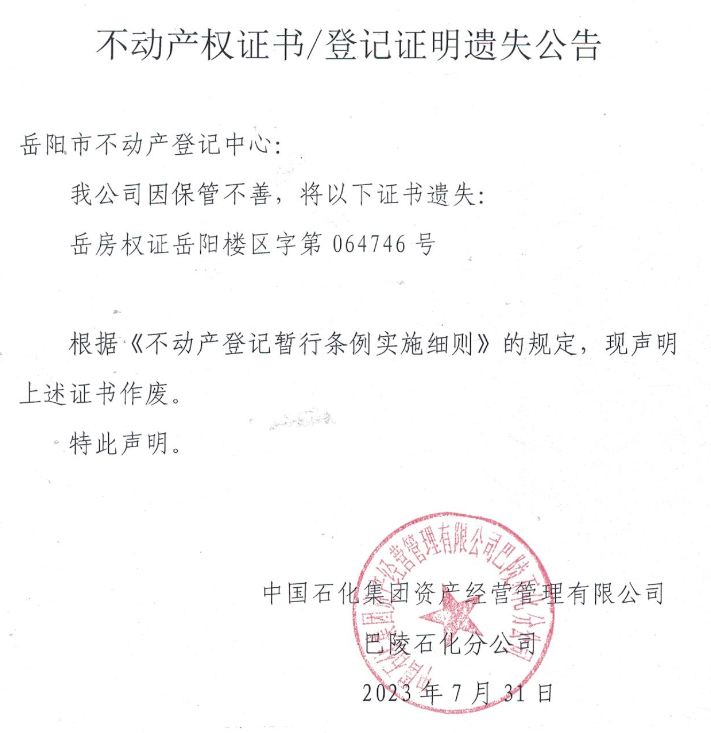 遗失公告(中国石化集团资产经营管理有限公司巴陵石化分公司)