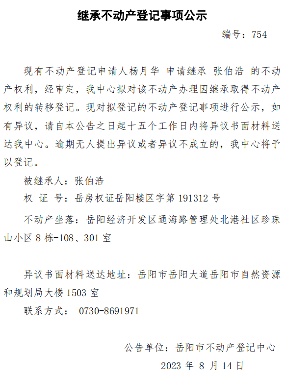 继承不动产登记公示 编号:杨月华 (754)