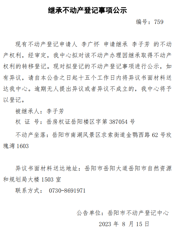 继承不动产登记公示 编号:李广怀(759)