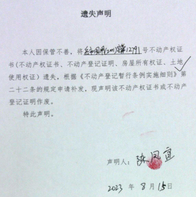 遗失声明(陈凤宜)