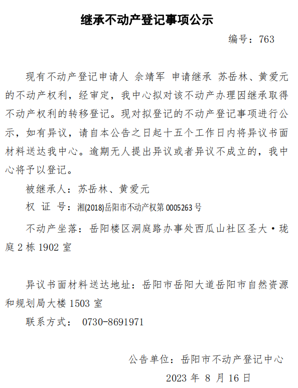 继承不动产登记公示 编号:佘靖军(763)