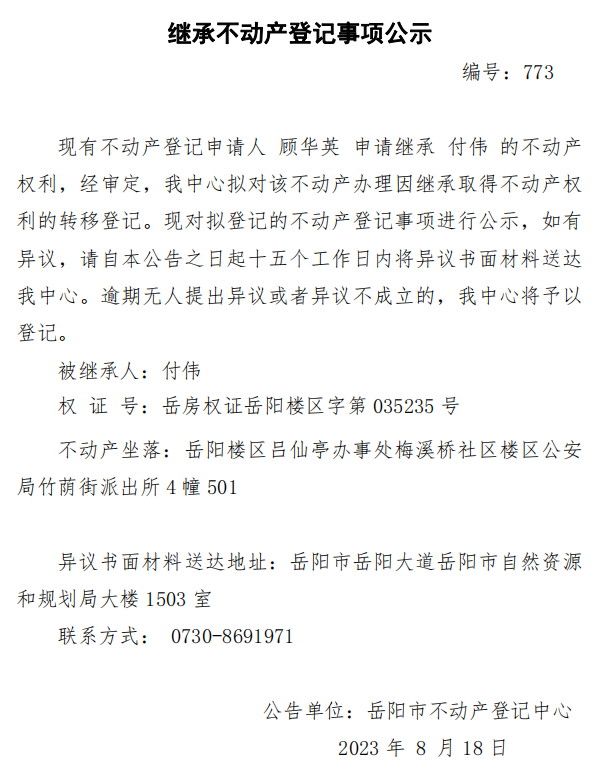 继承不动产登记公示 编号: 顾华英(773)