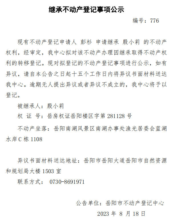 继承不动产登记公示 编号:彭杉(776)