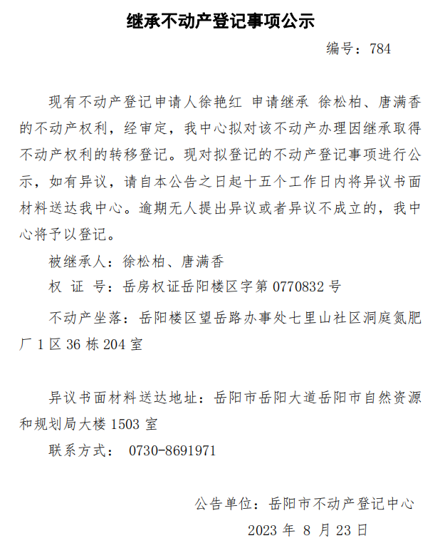 继承不动产登记公示 编号:徐艳红 (784)