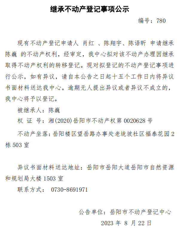 继承不动产登记公示 编号:肖红 、陈翔宇、陈语昕(780)