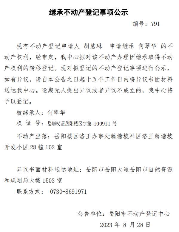继承不动产登记公示 编号:胡慧琳(791)