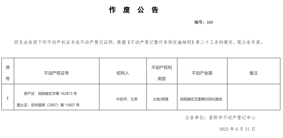 作废公告 编号:叶拾平、王英(103)