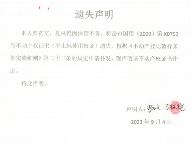 遗失声明(罗玄文、夏林艳)