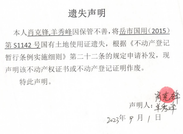 遗失声明(肖克锋、羊秀峰)