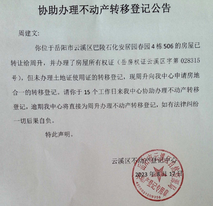 协助办理不动产转移登记的公示