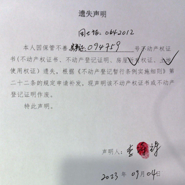 遗失声明(李诗辉)
