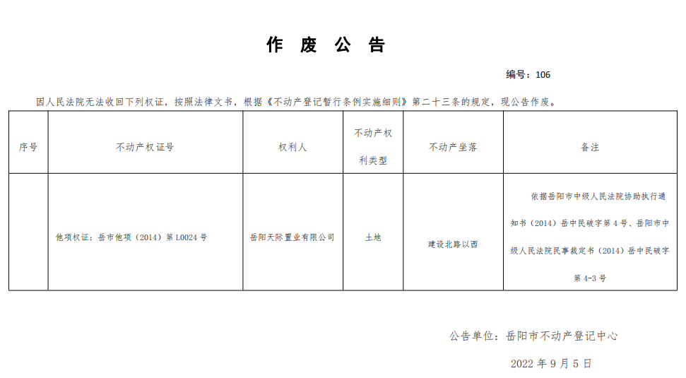作废公告 编号:岳阳天际置业有限公司(106)