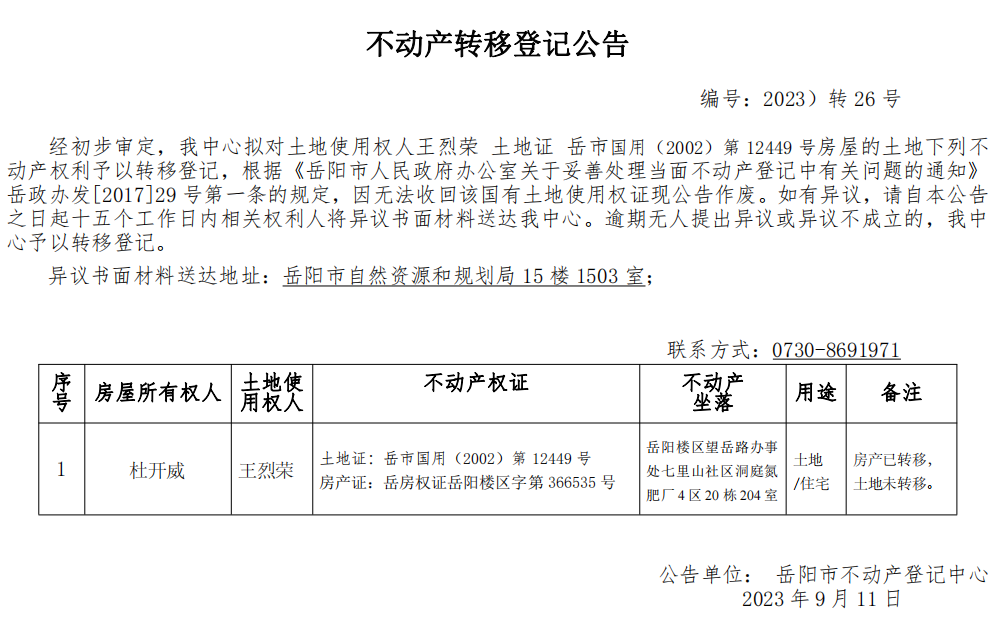 不动产转移登记公告 编号:(2023)转26(王烈荣)