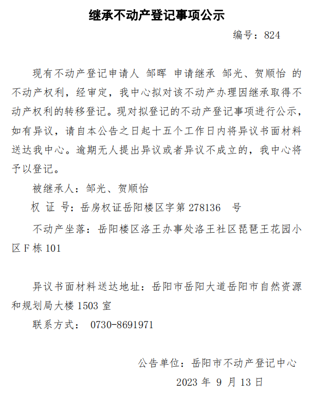 继承不动产登记公示 编号:邹晖(824)
