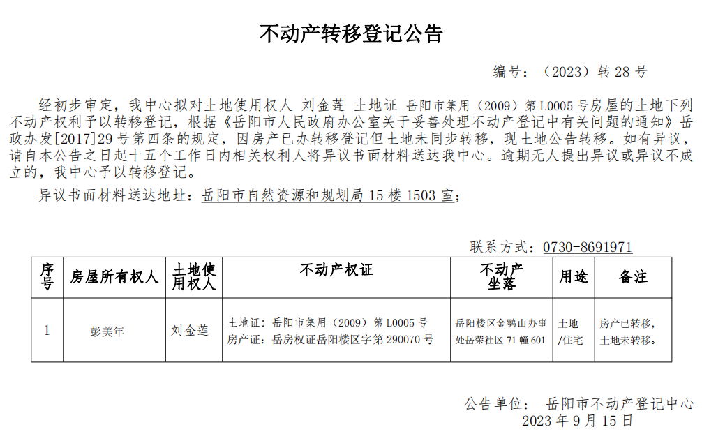 不动产转移登记公告 编号:(2023)转28(刘金莲)