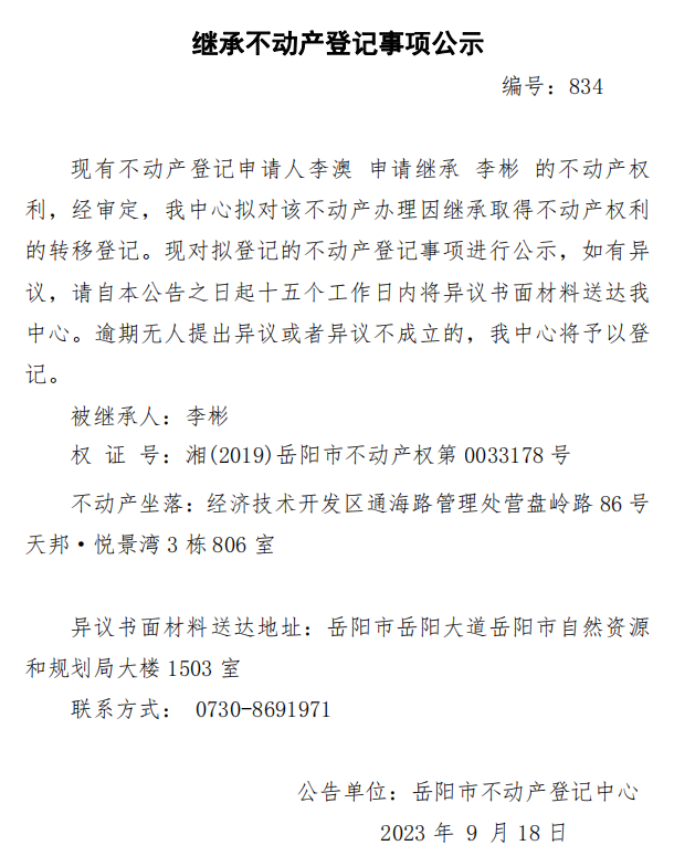继承不动产登记公示 编号:李澳(834)