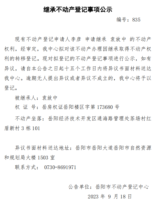 继承不动产登记公示 编号:李彦(835)