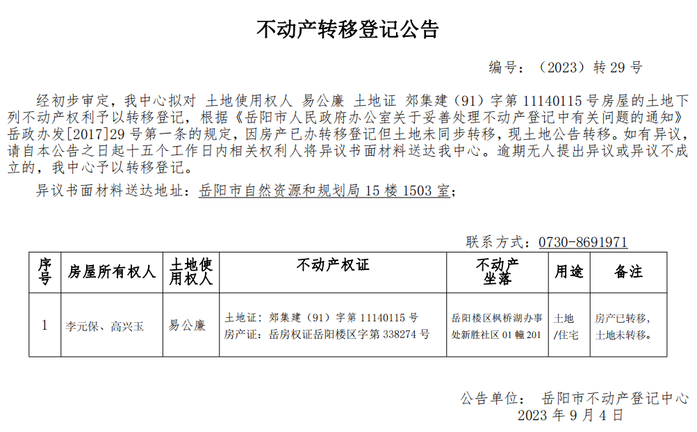 不动产转移登记公告 编号:(2023)转29(易公廉)