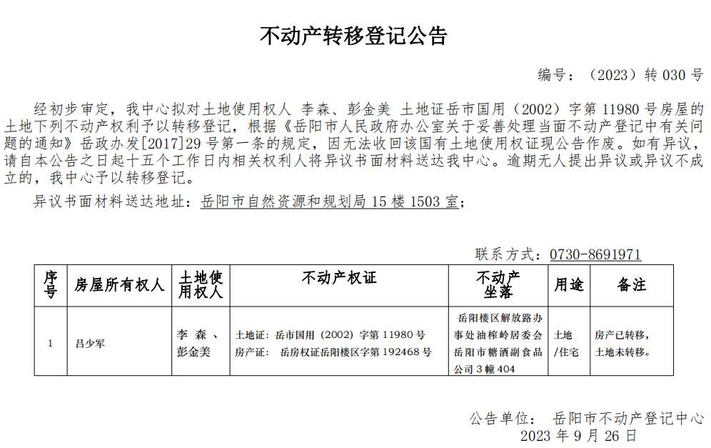 不动产转移登记公告 编号:(2023)转030(李森、彭金美)