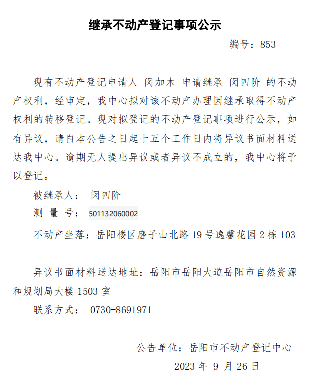 继承不动产登记公示 编号:闵加木(853)