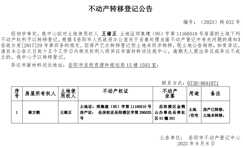 不动产转移登记公告 编号:(2023)转032(王绪正)