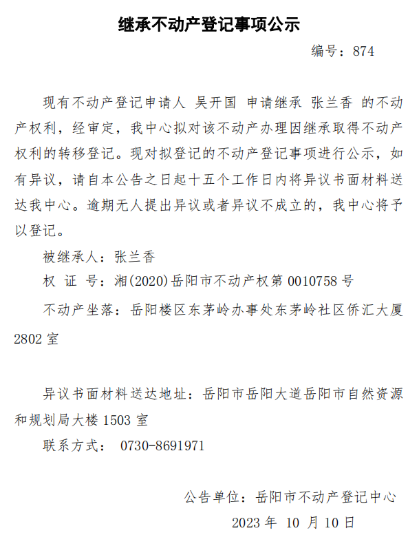 继承不动产登记公示 编号:吴开国(874)