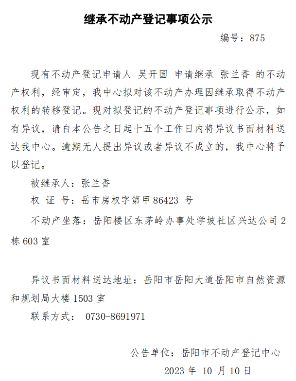 继承不动产登记公示 编号:吴开国(875)