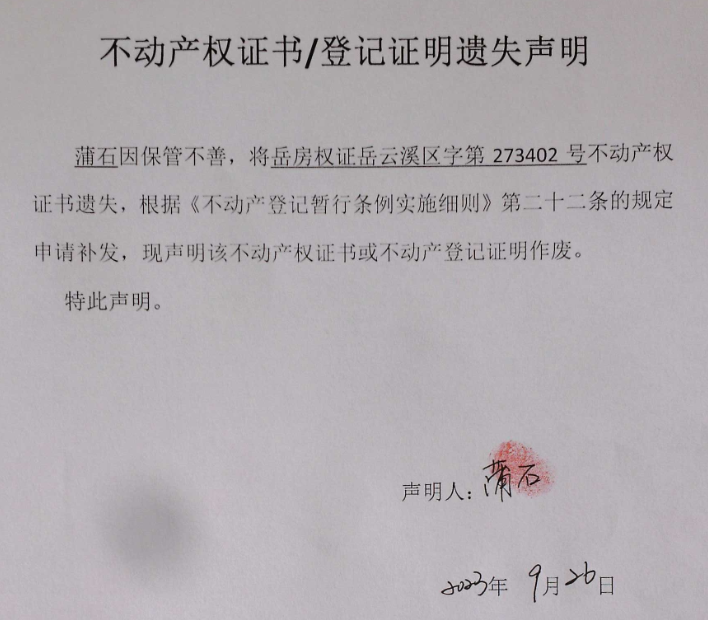 不动产权证书遗失证明(蒲石)