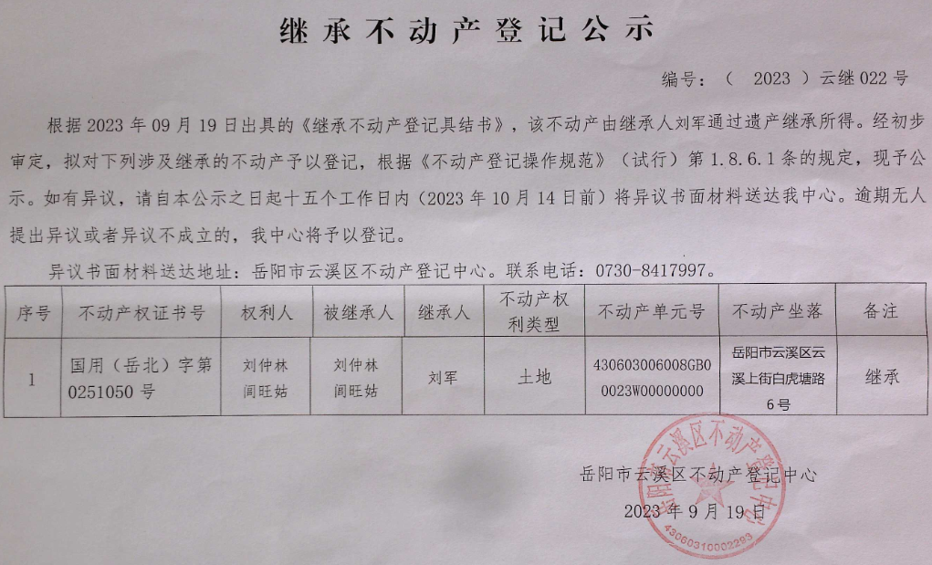 继承不动产公示 编号:(2023)云继022号