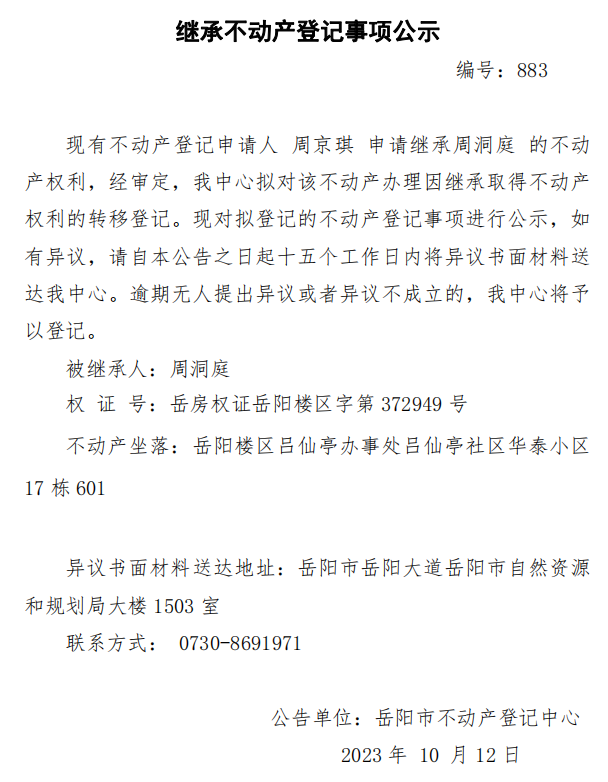 继承不动产登记公示 编号:周京琪(883)