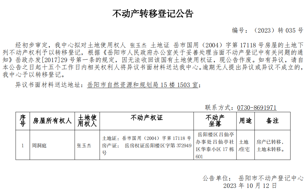 不动产转移登记公告 编号:(2023)转035((张玉杰)