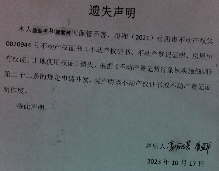 遗失申明(郭丽芳、唐亚平)