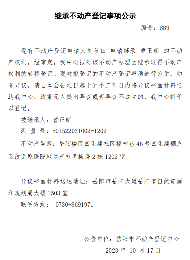 继承不动产登记公示 编号:刘秋田(889)