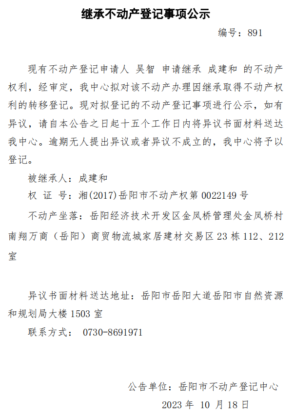 继承不动产登记公示 编号:吴智(891)