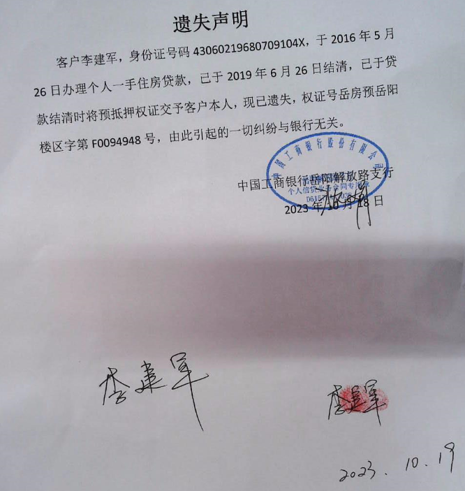遗失声明(中国工商银行股份有限公司岳阳解放路支行)