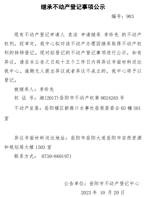 继承不动产登记公示 编号:袁洁(903)