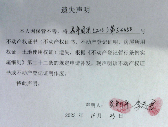 遗失声明(吴新平、李志君)