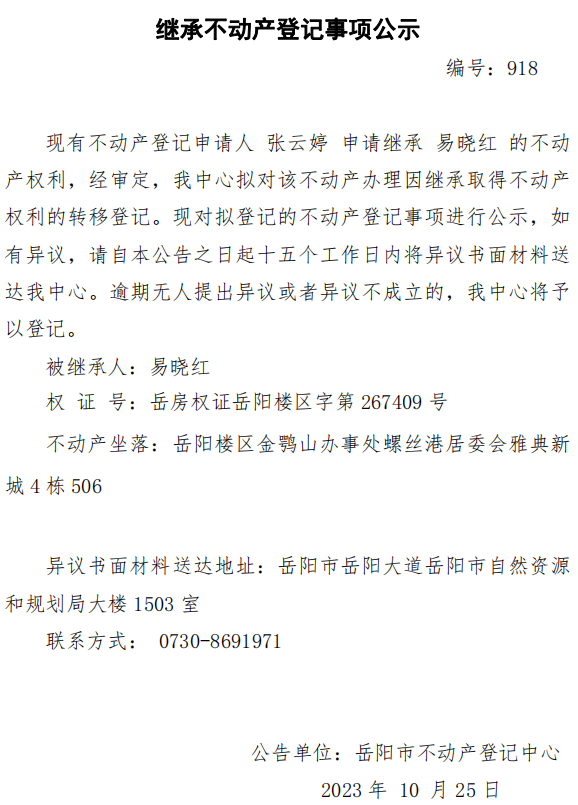 继承不动产登记公示 编号: 张云婷(918)
