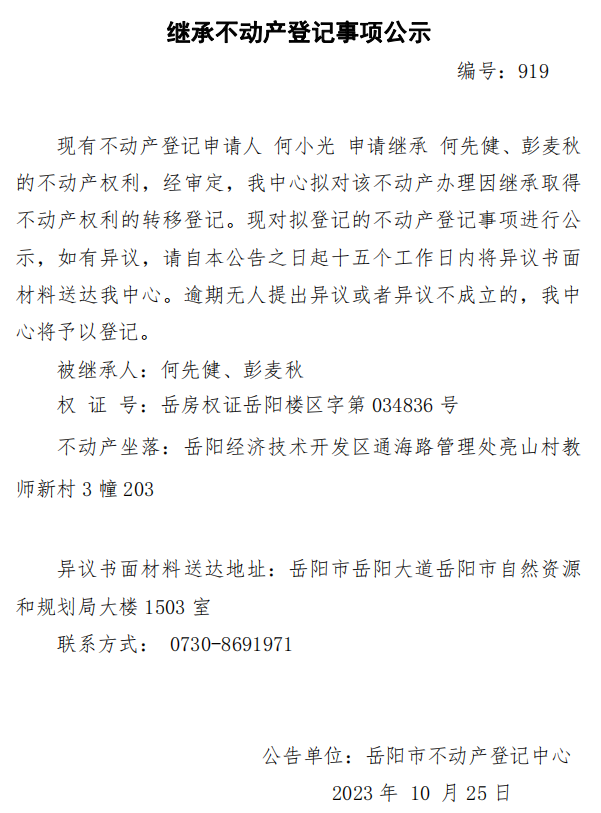 继承不动产登记公示 编号:何小光(919)