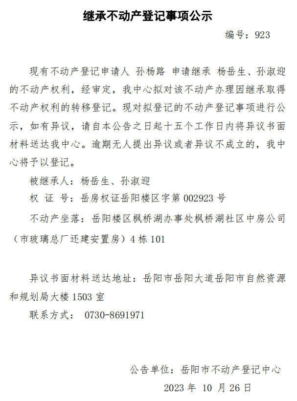 继承不动产登记公示 编号:孙杨路(923)