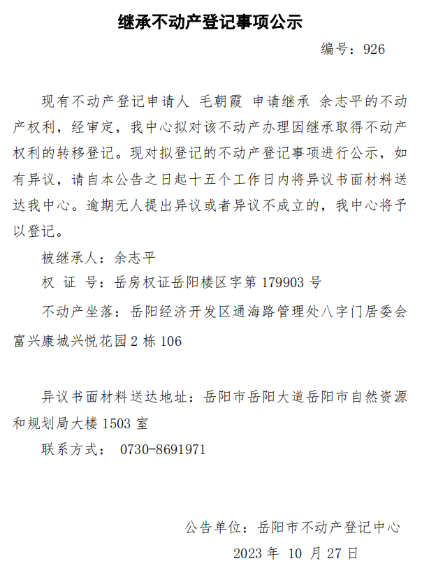 继承不动产登记公示 编号:毛朝霞(926)