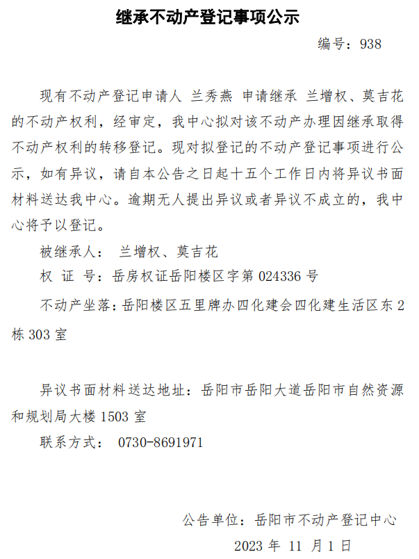 继承不动产登记公示 编号:兰秀燕(938)